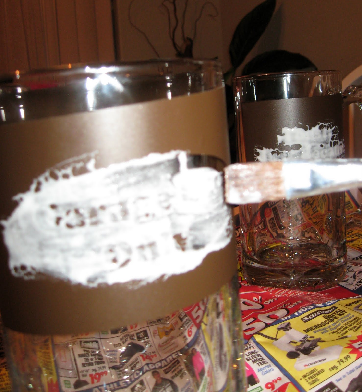 Once you have your stencil in place, it's time to apply your etching cream. I always wear gloves when I'm working with etching cream, although sometimes I think I'm just being overly cautious. I just use a soft bristle brush to apply a good layer of the cream to the stencil. I learned the hard way that if you use a brush that's too firm it can leave streaks with the etching cream.