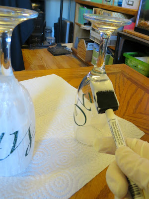 I carefully applied the stencil to the glasses. My idea was to do the Mr. and Mrs. designs in relief, so I made sure the stencil was exactly where I wanted it.